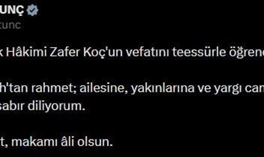 Tunç’un paylaşımından: "Yargıtay Tetkik Hakimi Zafer Koç’un vefatını teessürle öğrendim. Merhuma Allah’tan rahmet; ailesine, yakınlarına ve yargı camiamıza başsağlığı ve sabır diliyorum. Mekanı cennet, makamı ali olsun"