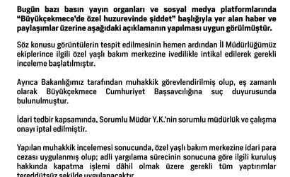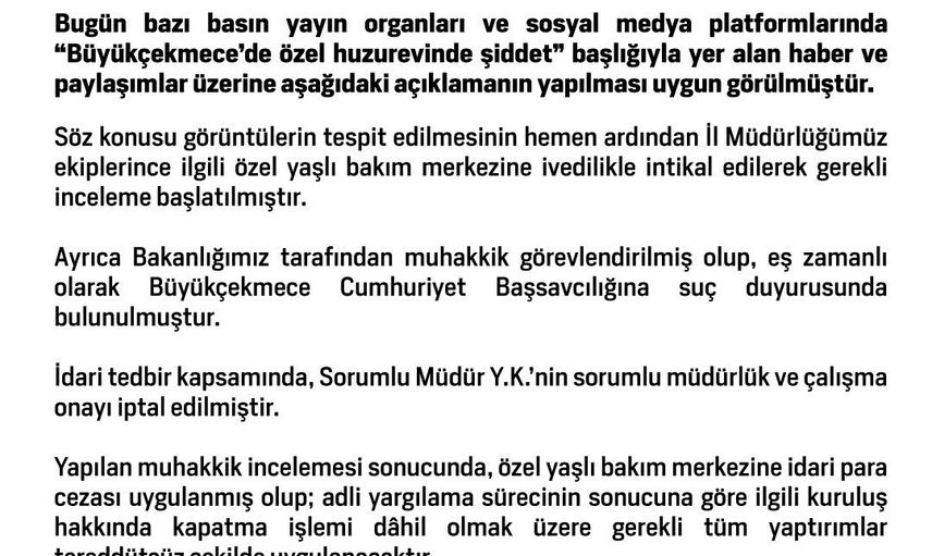 "Söz konusu görüntülerin tespit edilmesinin hemen ardından İl Müdürlüğümüz ekiplerince ilgili özel yaşlı bakım merkezine ivedilikle intikal edilerek gerekli inceleme başlatılmıştır. Ayrıca Bakanlığımız tarafından muhakkik görevlendirilmiş olup, eş zamanlı olarak Büyükçekmece Cumhuriyet Başsavcılığına suç duyurusunda bulunulmuştur. İdari tedbir kapsamında, Sorumlu Müdür Y.K.’nın sorumlu müdürlük ve çalışma onayı iptal edilmiştir. Yapılan muhakkik incelemesi sonucunda, özel yaşlı bakım merkezine idari para cezası uygulanmış olup; adli yargılama sürecinin sonucuna göre ilgili kuruluş hakkında kapatma işlemi dahil olmak üzere gerekli tüm yaptırımlar tereddütsüz şekilde uygulanacaktır."