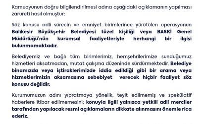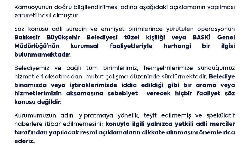 Belediye açıklamasında, "Söz konusu adli sürecin ve emniyet birimlerince yürütülen operasyonun Balıkesir Büyükşehir Belediyesi tüzel kişiliği veya BASKİ Genel Müdürlüğü'nün kurumsal faaliyetleriyle herhangi bir ilgisi bulunmamaktadır" ifadelerine yer verildi.