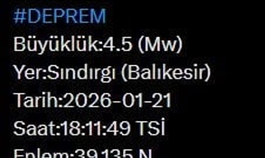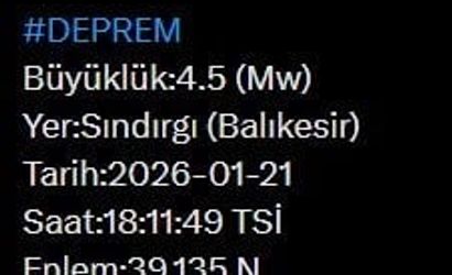 Afet ve Acil Durum Yönetimi Başkanlığı (AFAD), Balıkesir'in Sındırgı ilçesinde saat 18.11'de 4.5 büyüklüğünde bir deprem meydana geldiğini açıkladı.