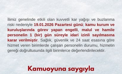 Bartın Valiliği tarafından yapılan yazılı açıklamada, il genelinde etkili olan kuvvetli kar yağışı ve buzlanma riski nedeniyle 19.01.2026 Pazartesi günü kamu kurum ve kuruluşlarında görev yapan engelli, malul ve hamile personelin 1 gün süreyle idari izinli sayılmasına karar verildiği bildirildi.