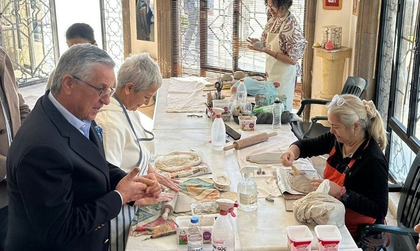 Kemer Belediyesi destekli atölyede 60 kişi seramik kursu alıyor. Ziyarette Topaloğlu ve beraberindekiler kursiyerlerle selamlaştı, yapılan eserleri inceledi ve kurs hakkında bilgi aldı.