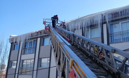 Bayburt'ta etkili olan soğuk hava nedeniyle bina saçaklarında oluşan buz sarkıtları, vatandaşların can güvenliğini tehdit ettiği gerekçesiyle müdahale ediliyor.
