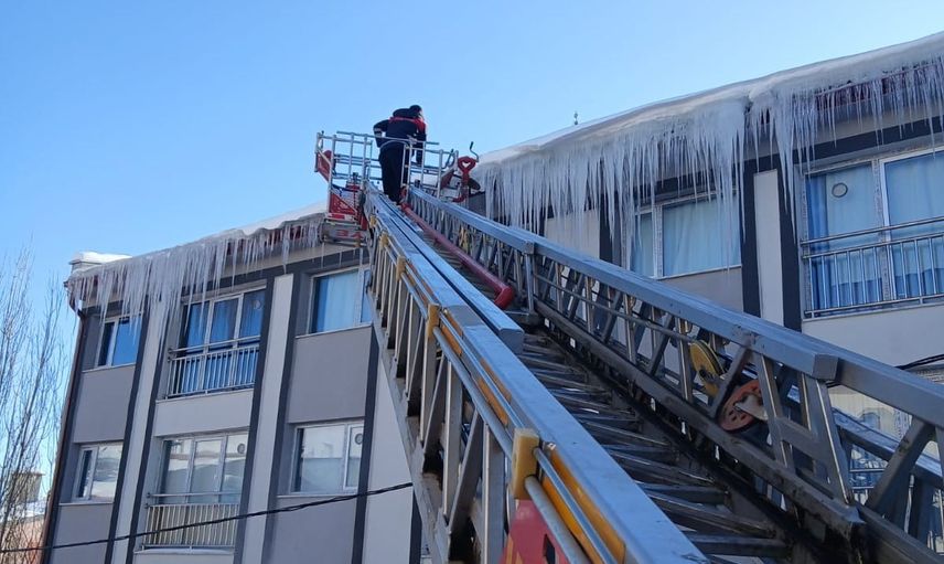 İtfaiye ekipleri, risk oluşturan noktalarda çalışma başlattı. İtfaiye aracı merdiveni yardımıyla çatı saçaklarında biriken buzlar kontrollü şekilde düşürülürken, evlerin pencere kenarlarında oluşan buzlar da ekiplerin gözetiminde kırılıyor.