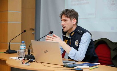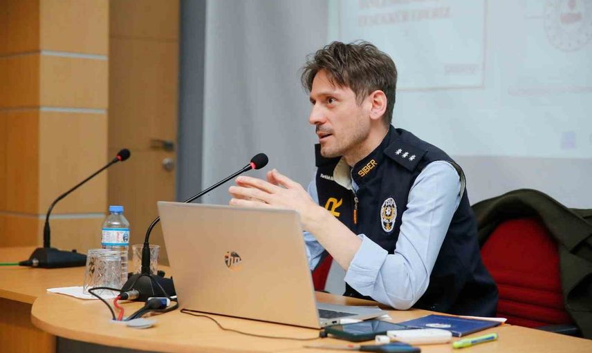 Konuşmacı olarak yer alan Başkomiser Yusuf Yılmaz (Siber Suçlarla Mücadele Şube Müdürlüğü) yapay zeka teknolojilerinin kötü amaçlarla nasıl kullanılabildiğini katılımcılara aktardı. Yılmaz, özellikle gençlerin dijital ortamlarda karşılaşabilecekleri risklere karşı daha dikkatli olmaları gerektiğini vurguladı.