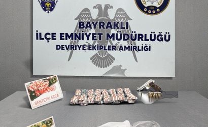 Bayraklı İlçe Emniyet Müdürlüğü Devriye Ekipler Amirliği ile Narkotik Suçlarla Mücadele Şube Müdürlüğü Sokak Suçları Büro Amirliği ekipleri, K.K. (32) isimli kişinin uyuşturucu ticareti yaptığı tespit edilince savcılık izniyle adrese operasyon düzenledi. Aramada, 896 adet uyuşturucu nitelikli hap, 66 gram esrar, ruhsatsız tabanca ve 26 adet fişek ele geçirildi.