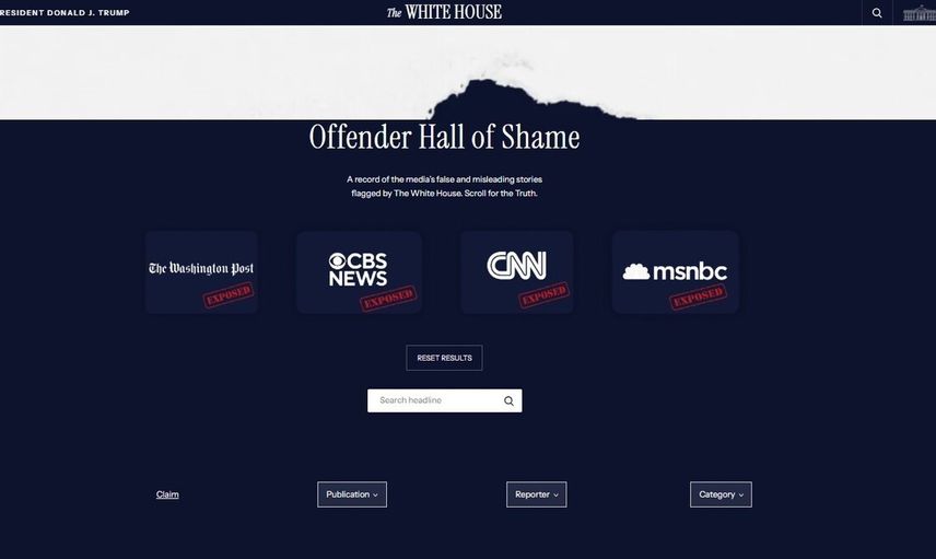 Beyaz Saray, resmi internet sitesine yeni bir başlık ekleyerek kendisinin "medya suçlusu" olduğunu iddia ettiği gazeteci ve medya kuruluşlarının adlarını açıkça yayınladı. Sayfada başlık olarak "Yanıltıcı. Taraflı. Teşhir edildi" ifadesi kullanıldı.