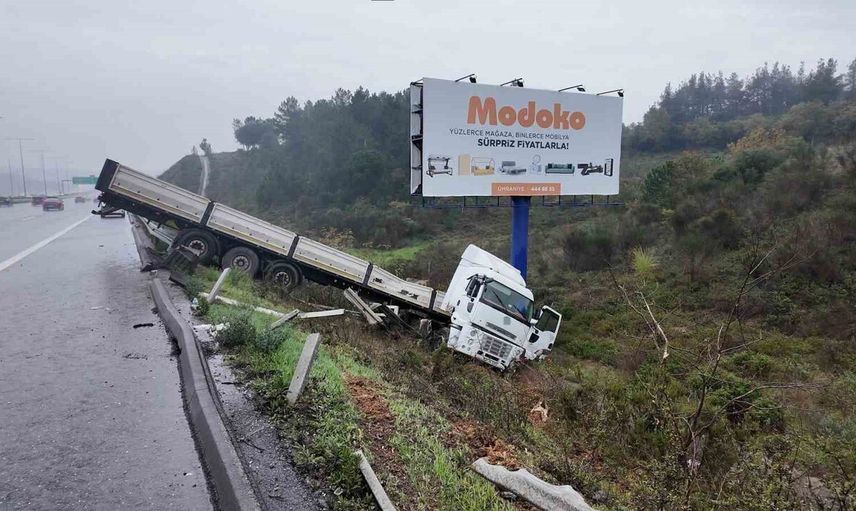 Kaza: Kuzey Marmara Otoyolu'nun Ümraniye istikametinde etkili olan sağanak yağış nedeniyle yol kayganlaştı. Saat 13.45 civarında sürücü O.Ö. yönetimindeki tır, direksiyon hakimiyetini kaybederek bariyerleri aştı ve şarampole devrildi.