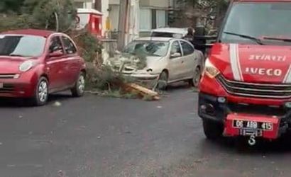 Ankara'nın Beypazarı ilçesi Ayvaşık Mahallesi'nde etkili olan fırtına nedeniyle bir ağaç, park halindeki bir otomobilin üzerine devrildi.