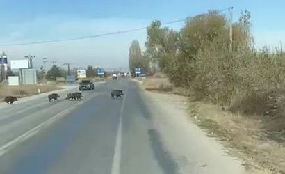Yolu kullanan sürücü, sürüyle karşılaşınca hızını azaltırken, domuzların yolun karşısına koşarak geçtiği anlar telefona yansıdı. Görüntülerde sürücünün "burayı domuzlar bastı" sözleri de duyuluyor.