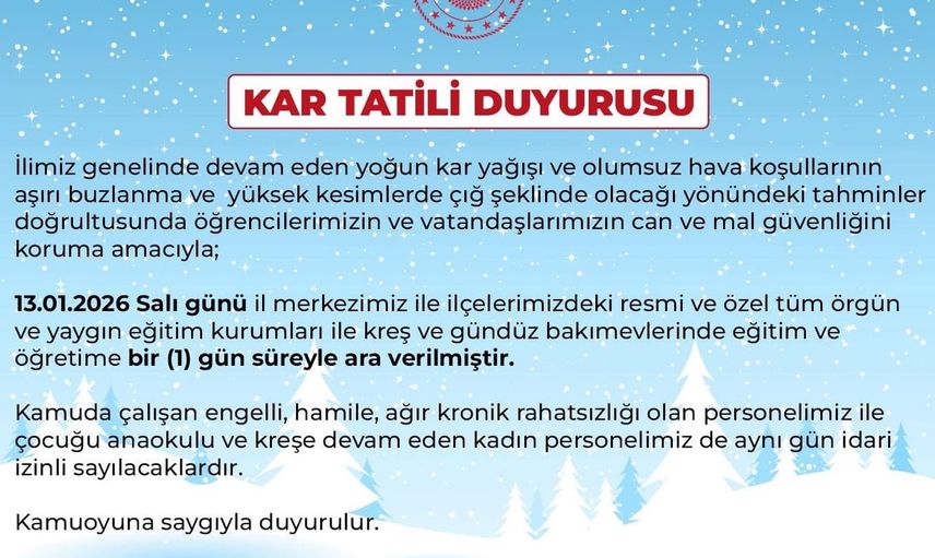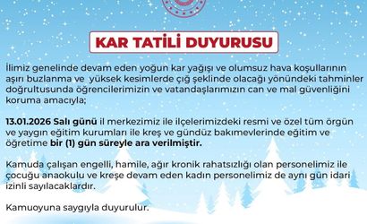 Bingöl Valiliği açıklamasında, il genelinde devam eden yoğun kar yağışı ile olumsuz hava koşullarının aşırı buzlanma ve yüksek kesimlerde çığ riski oluşturabileceği tahminleri doğrultusunda 13.01.2026 Salı günü il merkezi ile ilçelerdeki resmi ve özel tüm örgün ve yaygın eğitim kurumları ile kreş ve gündüz bakımevlerinde eğitim ve öğretime 1 gün süreyle ara verildiği belirtildi.