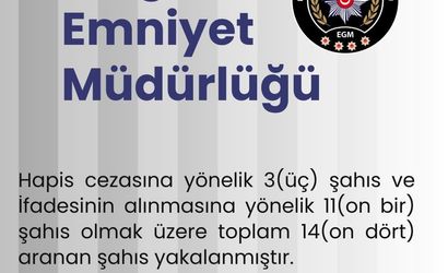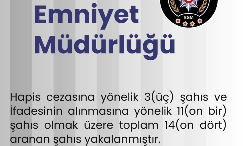 Çalışmalar kapsamında; 3'ü kesinleşmiş hapis cezası bulunan kişiler ile 11'i ifadelerinin alınmasına yönelik aramaları bulunan şahıslar olmak üzere toplam 14 kişinin yakalandığı kaydedildi.