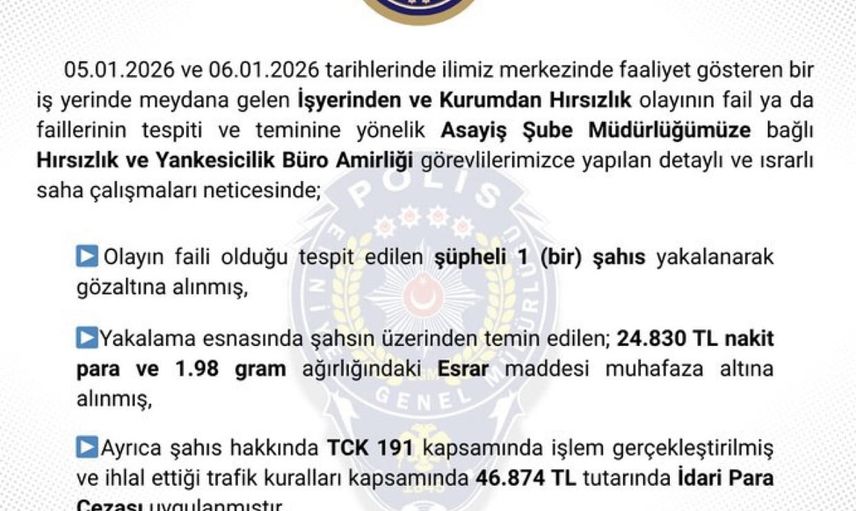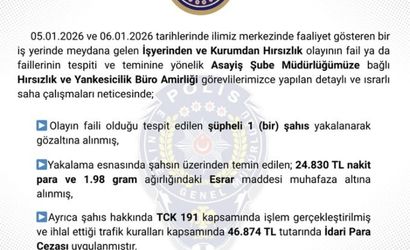 Çalışmalar sonucunda olayın faili olduğu tespit edilen bir şüpheli yakalanarak gözaltına alındı. Yakalama sırasında şahsın üzerinden 24.830 TL nakit para ve 1.98 gram ağırlığında esrar maddesi ele geçirildi.