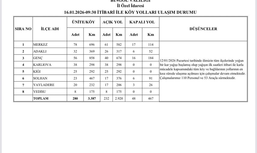 Bingöl'de etkili olan yoğun kar yağışı sonucu birçok köy yolu ulaşıma kapanmıştı. Sahada yürütülen kar temizleme ve açma çalışmaları sonucunda ilerleme sağlandı.