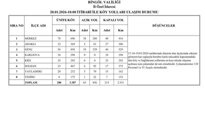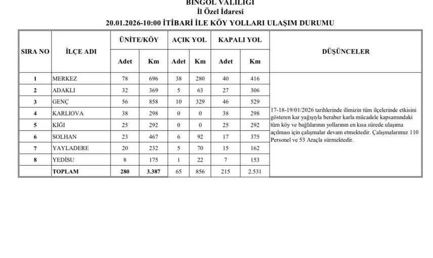 Bingöl genelinde kar nedeniyle kapanan köy yollarının ulaşıma açılması için yürütülen çalışmalar aralıksız devam ediyor. Bingöl İl Özel İdaresi koordinasyonunda sahada görev yapan ekiplerde 110 personel ve 53 araç bulunuyor. Ekiplerin yoğun çalışmasıyla gün içinde birçok köy yolu ulaşıma açıldı.