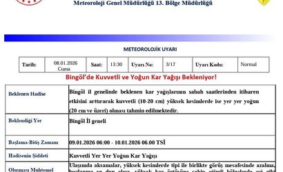 Meteoroloji 13. Bölge Müdürlüğü, Bingöl genelinde sabah saatlerinden itibaren başlayacak kar yağışlarının giderek kuvvetleneceğini bildirdi. Kurumun değerlendirmesine göre normal kesimlerde 10-20 cm aralığında kar düşmesi, yüksek rakımlı bölgelerde ise yer yer 20 cm ve üzeri kar örtüsü oluşması bekleniyor.