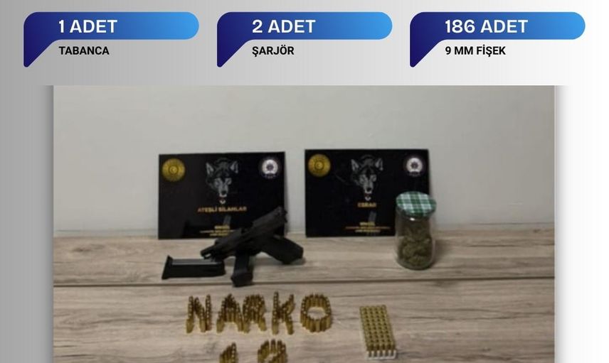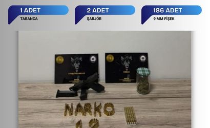 Bingöl'de gerçekleştirilen çalışmada, Bingöl İl Emniyet Müdürlüğü Narkotik Suçlarla Mücadele Şube Müdürlüğü ekiplerinin müdahalesi sonucunda 1 adet tabanca, 2 adet şarjör ve 186 adet fişek ele geçirildi.