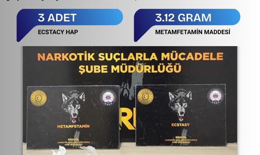 Bingöl Emniyet Müdürlüğü Narkotik Suçlarla Mücadele Şube Müdürlüğü ekipleri il genelinde yürüttükleri çalışmalar neticesinde yapılan operasyonda, 3 adet ecstasy hap ve 3,12 gram metamfetamin maddesi ele geçirildi.