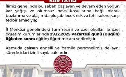 "İlimiz genelinde bu sabah başlayan ve devam eden yoğun kar yağışı ve olumsuz hava şartlarına bağlı olarak buzlanma ve ulaşımda oluşabilecek risk ve tehlikelere karşı tedbir amacıyla; il merkezi genelindeki tüm resmi ve özel okullar ile özel öğretim kurumlarında 29.12.2025 Pazartesi günü (Bugün) öğleden sonra eğitim öğretime ara verilmiştir. Kamuda çalışan engelli ve hamile personelimiz de aynı sürede idari izinli sayılacaklardır"