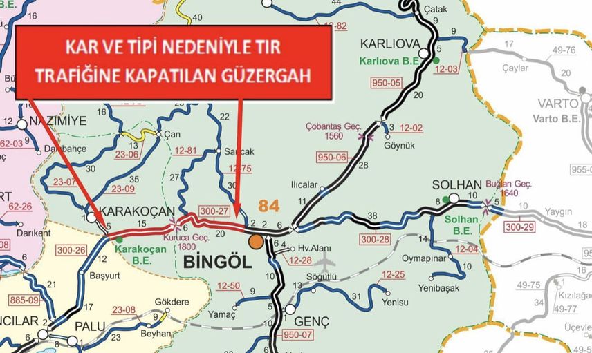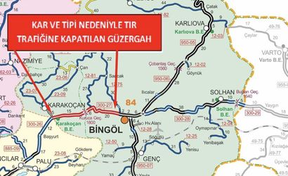 Bingöl Valiliği’nden yapılan açıklamada, "Bingöl-Elazığ Devlet Yolunun 0-51 km’leri arası (Bingöl Sancak kavşağı ile Karakoçan ayrım kavşağı arası) yoğun kar yağışı ve tipi nedeniyle saat 19.50 itibarıyla TIR trafiğine kapatılmıştır" denildi.