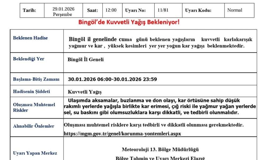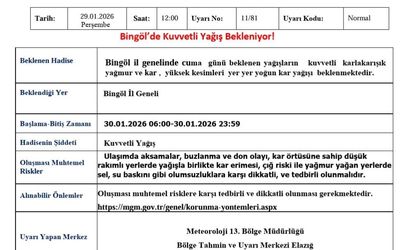 Meteoroloji 13. Bölge Müdürlüğü tarafından yapılan açıklamada, Bingöl il genelinde Cuma günü beklenen yağışların kuvvetli karla karışık yağmur ve kar şeklinde olacağı; yüksek kesimlerde ise yer yer yoğun kar yağışı beklendiği bildirildi.