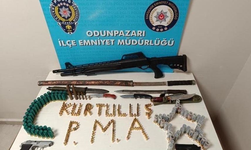 Eskişehir'de bir kişiye bisikletle çarpıp silah göstererek tehditte bulunduğu belirlenen zanlı yakalandı; iş yerinde çok sayıda suç unsuru bulundu.