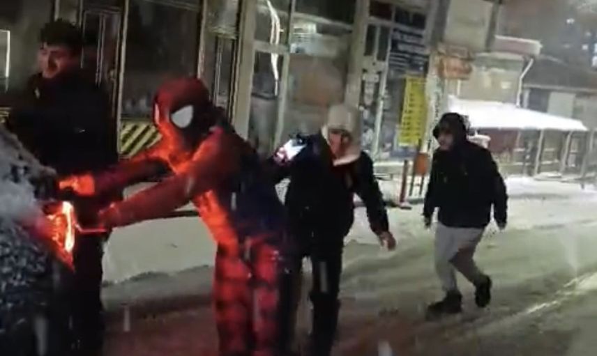 Bitlis'te etkili olan yoğun kar yağışı sırasında yolda ilerleyemeyen bir sürücünün yardımına örümcek adam kostümü giyen Ayaz Salih Koç yetişti.