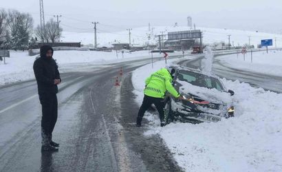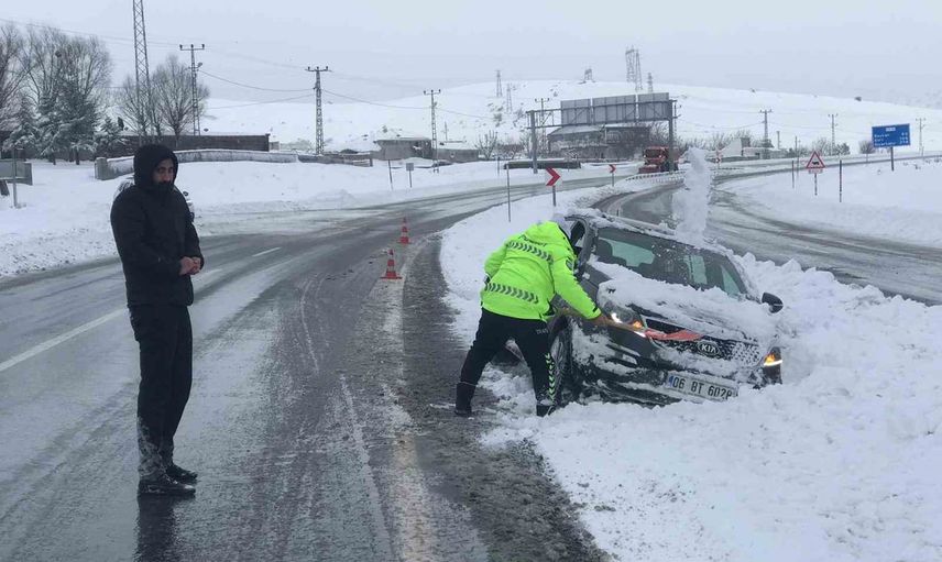 İl Emniyet Müdürlüğü'ne bağlı Trafik Tescil Şube Müdürlüğü ekipleri, kara saplanan otomobillerin önündeki karları kar kürekleri ile temizleyerek araçların hareket etmesini sağladı. Ekiplerin saha çalışması sayesinde birçok araç kısa sürede yoldan çıkarıldı ve trafikte aksamaların önüne geçildi.