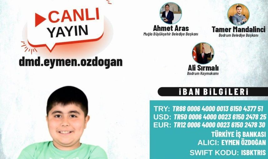 Muğla'nın Bodrum ilçesinde yaşayan DMD kas hastası Eymen Özdoğan'ın tedavi giderlerine destek sağlamak amacıyla "Büyük Yardım Gecesi" düzenlenecek.
