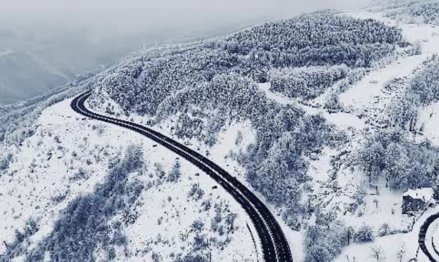 Çam ağaçlarının karla bütünleştiği ve iki ana ulaşım aksının aynı karede yer aldığı anlar drone ile kaydedildi. Bölgedeki sis ve kar bulutlarının yarattığı atmosfer de görüntülere yansıdı.