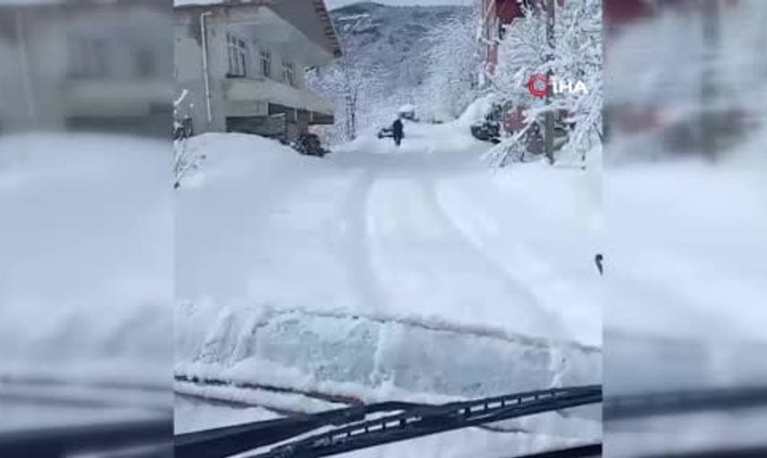 Kastamonu İl Özel İdaresi ekiplerinin yürüttüğü yol açma çalışması sırasında, iş makinesini gören bir köy sakini sevinçle oynadı. Vatandaşın mutluluk anları, iş makinesi operatörü tarafından kayda alındı.