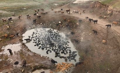 Mandalar kaplıca suyunda vakit geçirerek hem temizleniyor hem de soğuk kış koşullarından korunuyor. Dron görüntülerinde yoğun olarak bir arada bulunan mandalar ve çevredeki büyükbaşlar, adeta Afrika savanlarını anımsatan bir görünüm sunuyor.