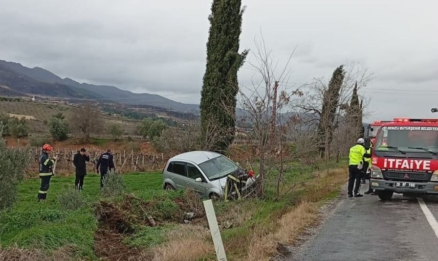 Buldan’da yağış sonrası kaygan yolda otomobil üzüm bağına uçtu