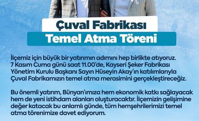 Bünyan Belediyesi'nin yaptığı açıklamaya göre, temel atma töreni 7 Kasım Cuma günü saat 11.00'de gerçekleşecek. Törene, Kayseri Şeker Fabrikası Yönetim Kurulu Başkanı Hüseyin Akay da katılacak.