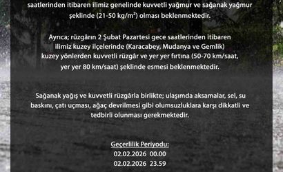 Yapılan son meteorolojik değerlendirmelere göre, 2 Şubat Pazartesi günü öğle saatlerinden itibaren Bursa genelinde kuvvetli yağmur ve sağanak bekleniyor.