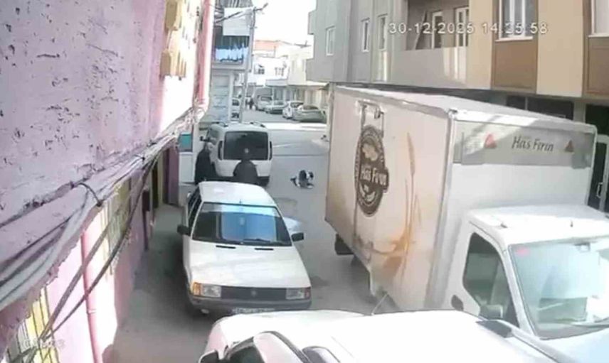 BURSA'DA EKMEK KAMYONETİNİN ARKA KAPISINI AÇIK UNUTAN SÜRÜCÜSÜ, YANINDAN GEÇTİĞİ GENCİ YERE SERDİ. O ANLAR GÜVENLİK KAMERASINA YANSIDI.