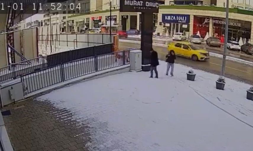 Bursa'da soğuk havanın etkili olduğu bir günde, karla kaplanan kaldırım üzerinde yürüyen bir çiftin romantik anları güvenlik kamerasına takıldı. Çift, yerde biriken karın üzerine bir kalp çizerek duygularını sembolize etti.