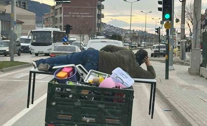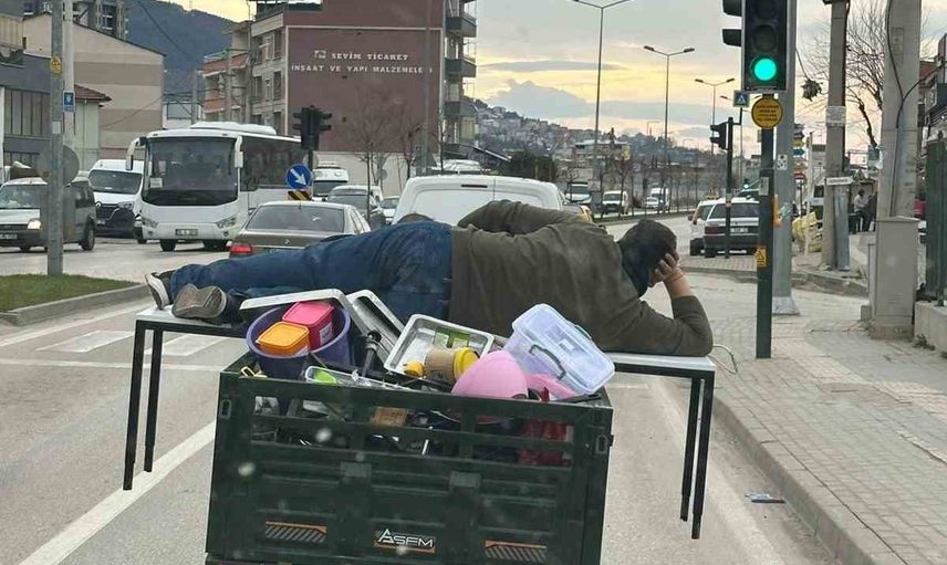 Bursa trafiğinde bir kişinin motosikletin kasa kısmına yerleştirilen masanın üzerine uzanarak yolculuk yapması, hem ilgi çekti hem de endişe yarattı.