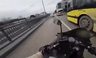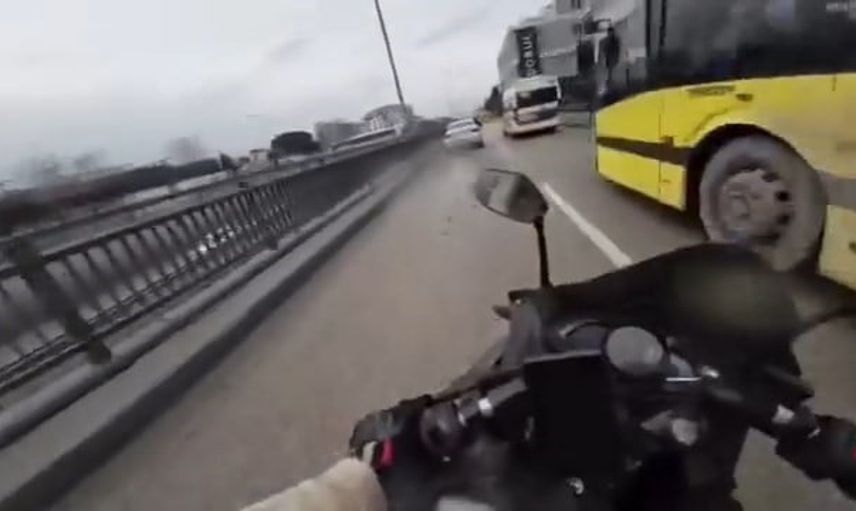 Motosiklet sürücüsü aniden hızlanınca, önünde ilerleyen otobüse çarpmamak için sol şeritteki otomobilin önüne doğru geçti. Bu sırada direksiyon hakimiyetini kaybeden motosiklet, sağa ve sola yalpaladı. Kısa sürede direksiyonu toparlayan sürücü yola devam etti.