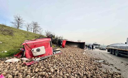 Bursa'da şeker pancarı yüklü tır devrildi: 1'i ağır, 5 yaralı