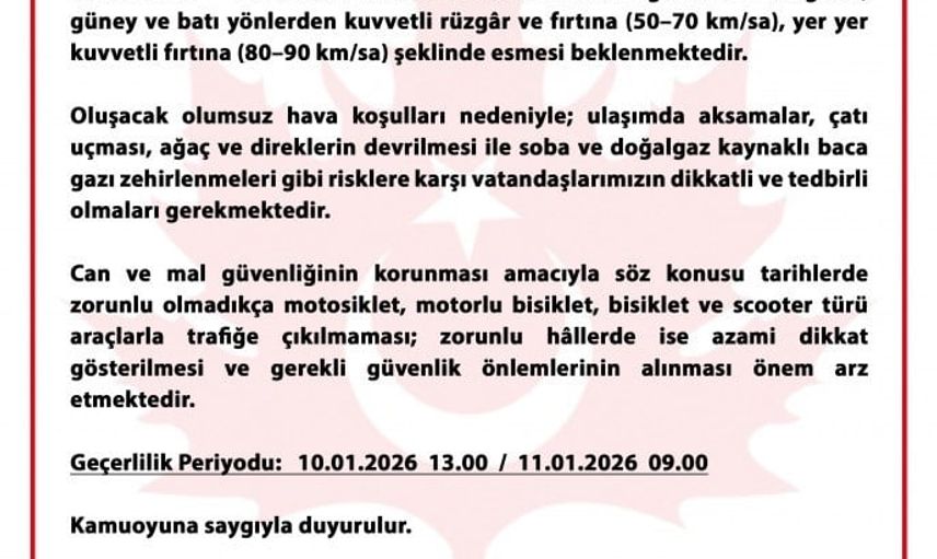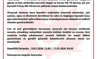 Açıklamada, 10-11 Ocak 2026 tarihleri arasında il genelinde rüzgârın 50-70 kilometre/saat hızla kuvvetli rüzgâr ve fırtına; yer yer ise 80-90 kilometre/saat hızla kuvvetli fırtına şeklinde esmesinin öngörüldüğü ifade edildi.