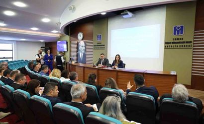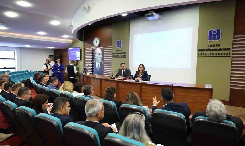 Toplantı sonunda Antalya Meslek Odaları Eşgüdüm Kurulu Başkanı Mehmet Soner Akdoğan, Başkan Vekili Büşra Özdemir'e günün anısına bir plaket takdim etti.