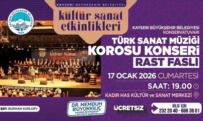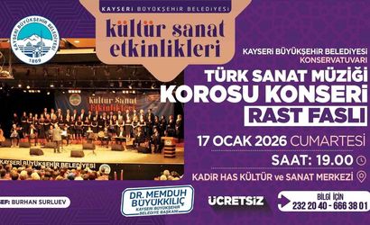 Kayseri Büyükşehir Belediyesi Konservatuvarı Türk Sanat Müziği Korosu, Klasik Türk Musikisi’nin en köklü makamlarından Rast Faslını geniş bir repertuvarla sanatseverlerle buluşturuyor. Etkinlik, kentin kültür yaşamını zenginleştirme hedefi doğrultusunda hazırlanmış konserlerden biri olarak öne çıkıyor.