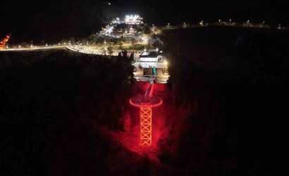 KİRAZLIDERE'DE BULUNAN CAM SEYİR TERASI, FARKINDALIK OLUŞTURMAK AMACIYLA KIRMIZI RENKTE IŞIKLANDIRILDI.