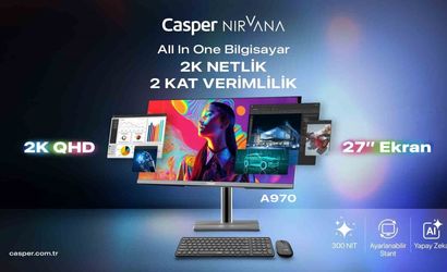 Casper Nirvana A970, 27" 2K QHD IPS paneli ve ergonomik metal standı ile kurumsal ofisler ve profesyonel çalışma alanları için tasarlanmış bir hepsi bir arada (AIO) çözüm sunuyor. Şık tasarımı, kompakt yapısı ve yüksek performans odaklı donanımıyla yoğun iş süreçlerinde verimliliği artırmayı hedefliyor.