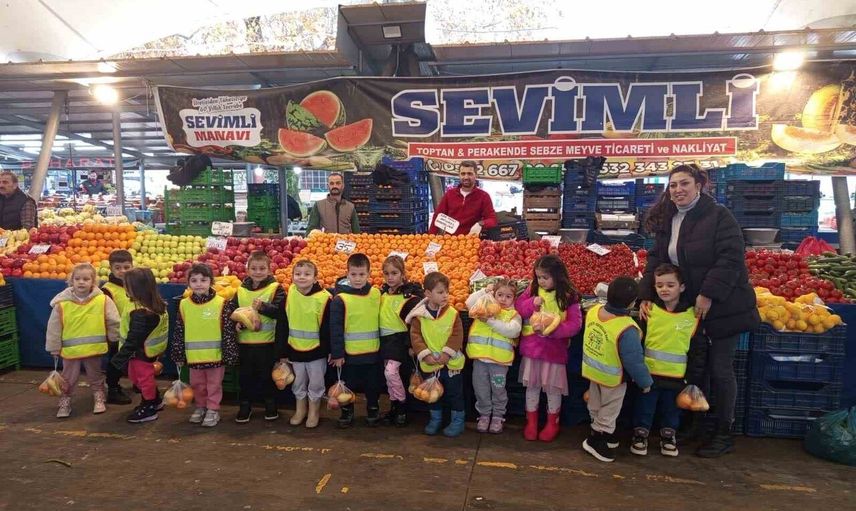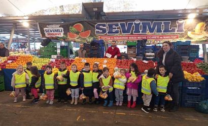 Okul Müdürü Mevlüt Torlakcık ve öğretmenler eşliğinde pazarı gezen minikler, tezgâhları dolaşıp yerli ürünleri tanıdı. Çocuklar hem küçük alışverişler yaptı hem de vatandaşlara yerli üretimin önemini anlatan broşürler dağıtarak farkındalık oluşturdu.