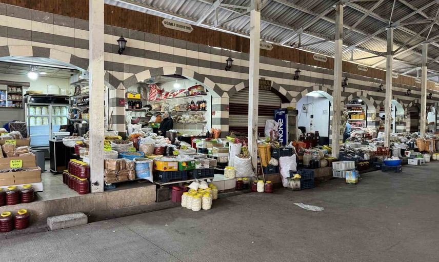 Kuruyemiş pazarında; üzüm suyundan yapılan pestil, cevizli sucuk, helva ile birlikte ceviz, kuru üzüm, badem, közde kavrulmuş leblebi, kuru kayısı, kuru incir ve menengiç kahvesi gibi ürünler yer alıyor.