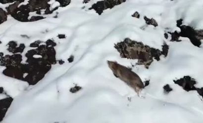 Diyarbakır'ın Çermik ilçesinde etkili olan kar yağışı, özellikle dağlık alanlarda yaşayan yaban hayatını zor durumda bıraktı. Bu koşullarda yiyecek arayan bir kurt, Karadere mevkiinde drone ile görüntülendi.