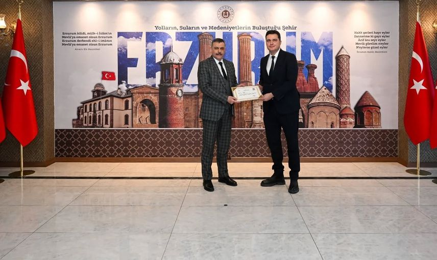 Erzurum Valisi Mustafa Çiftçi, çevre yatırımlarına sağladıkları katkılardan dolayı DSİ 8. Bölge Müdürü Oğuzhan Yavuz ile Karayolları 12. Bölge Müdürü Fatih Günaydın'a başarı belgesi verdi.