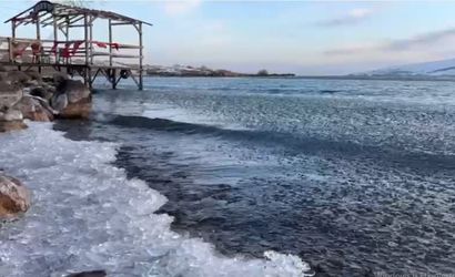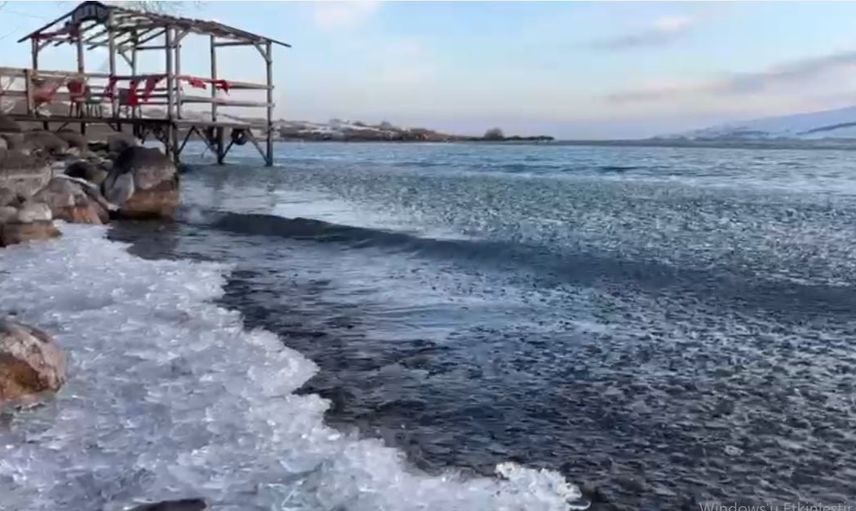 YÜZEYİ KISMEN DONAN ÇILDIR GÖLÜ RÜZGÂRIN ETKİSİYLE ÇÖZÜLÜNCE BUZULLARI ARATMAYAN GÖRÜNTÜLER ORTAYA ÇIKTI